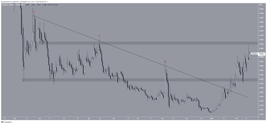 Vị trí cuối cùng trong danh sách các Altcoin tăng mạnh nhất tuần là Loopring. Giá LRC đã tăng kể từ khi thoát ra khỏi đường kháng cự giảm dần vào ngày 25/1. Chuyển động đi lên đã dẫn đến mức cao 0.49 USD vào ngày 16/2. Tuy nhiên, mã thông báo đã không thoát ra khỏi vùng kháng cự 0.50 USD. Xu hướng giá chỉ có thể được coi là tăng khi LRC đột phá kháng cự. Nếu LRC đột phá thành công, giá LRC có thể tăng lên 0.65 USD. Thay vào đó, nếu LRC bị từ chối, giá có thể giảm xuống 0.34 USD.