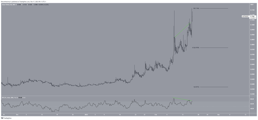 Ngoài ra, mô hình được kết hợp với sự phân kỳ giảm giá trong chỉ số RSI (đường màu xanh lá cây). Do đó, việc giảm xuống mức hỗ trợ thoái lui Fibo 0.5 ở mức 0.077 USD có thể xảy ra. Mặt khác, nếu đà tăng giá tiếp tục, giá ASTR có thể tăng lên 0.140 USD.