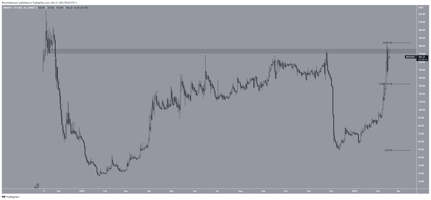 Sau Mina, BinaryX là cái tên tiếp theo được BeInCrypto nhắc đến trong danh sách các Altcoin tăng mạnh nhất tuần. Giá BNX đã tăng nhanh kể từ đầu năm 2023. BNX đạt mức cao nhất là 184.29 USD vào ngày 13/2. Tuy nhiên, BNX đã tạo ra một nến nhấn chìm giảm giá và giảm vào ngày hôm sau. Nếu giá BNX vượt qua vùng kháng cự, nó có thể tăng lên 230 USD. Tuy nhiên, nếu BNX bị từ chối bởi kháng cực, BNX có thể giảm xuống còn 132.50 USD.