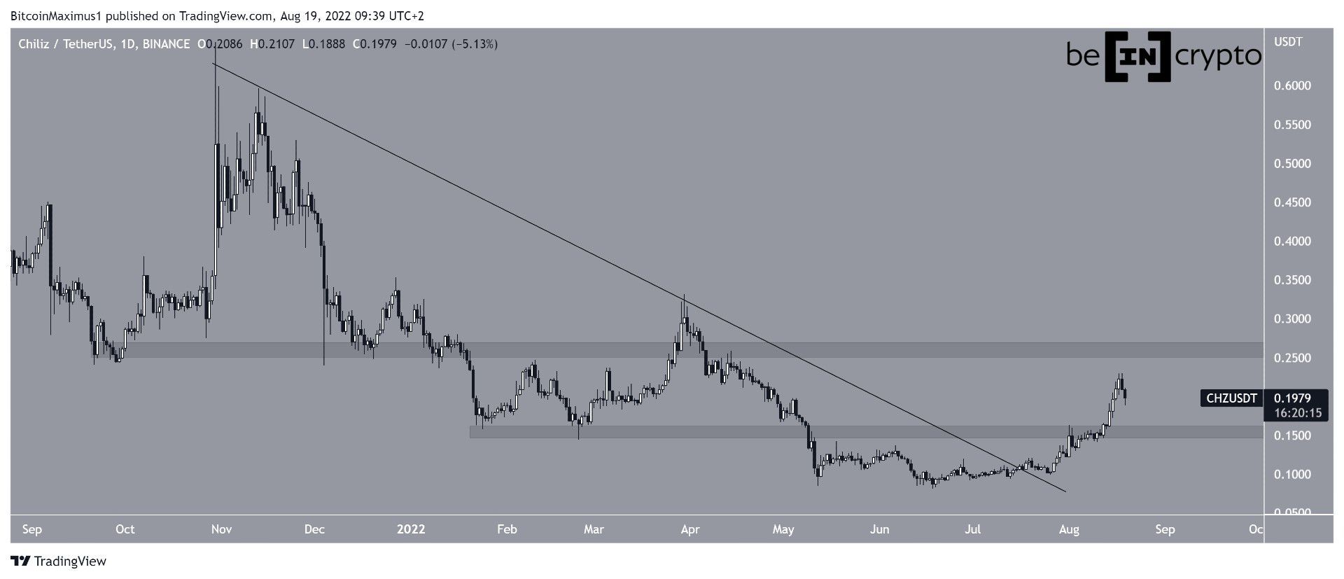 Chiliz (CHZ) đã tăng kể từ ngày 18 tháng 6. Xu hướng giảm đã gây ra sự bứt phá khỏi đường kháng cự giảm dần và dẫn đến mức cao nhất là 0.26 USD vào ngày 18 tháng 8. Tuy nhiên, CHZ đã không vượt qua được vùng kháng cự 0.28 USD và giá đã giảm kể từ đó. Vùng hỗ trợ gần nhất hiện tại là 0.155 USD.