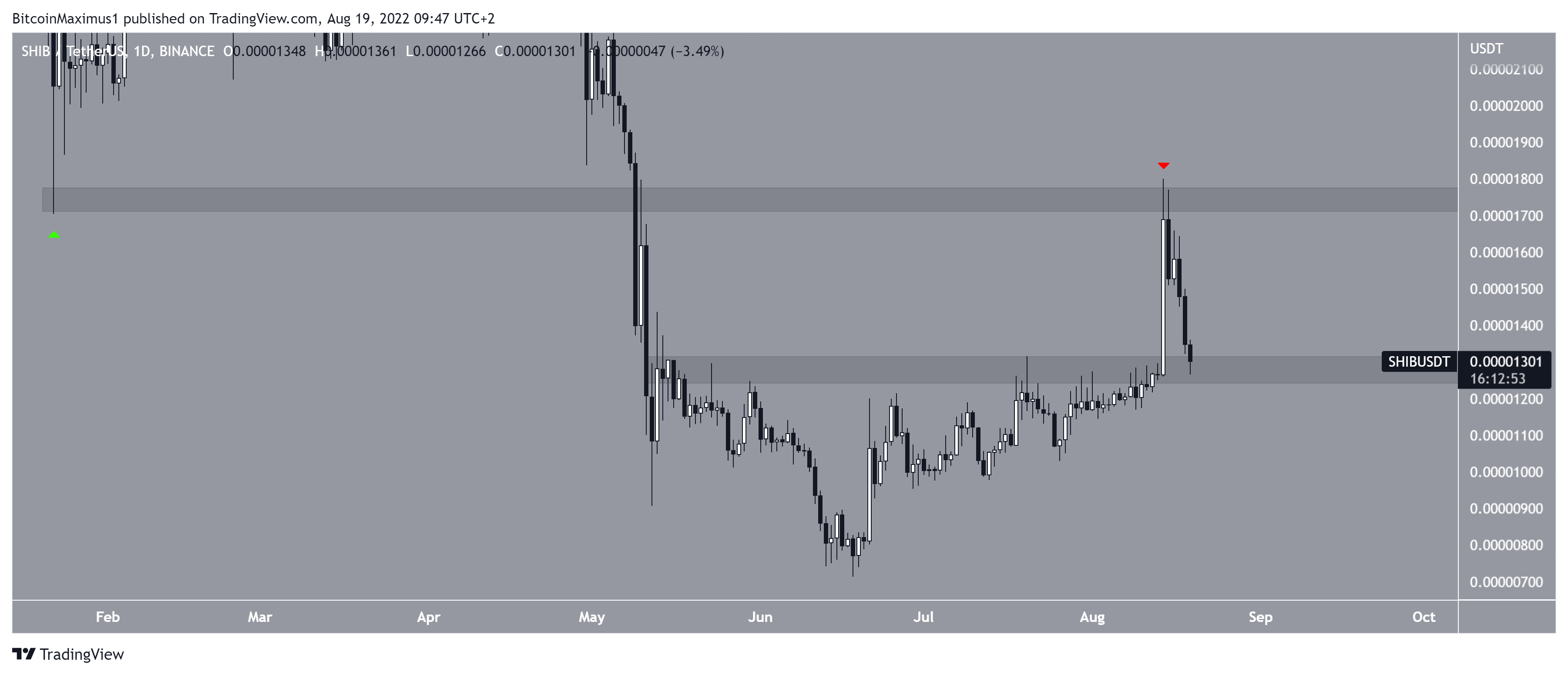 Shiba Inu (SHIB) đã tăng lên kể từ ngày 18 tháng 6. Nó đã bứt phá khỏi vùng kháng cự 0.0000128 USD vào ngày 14 tháng 8 và đạt mức cao 0.000018 USD trong cùng ngày. Tuy nhiên, giá đã bị từ chối bởi vùng kháng cự 0.000018 USD, một mức quan trọng trước đó đã đóng vai trò là hỗ trợ (biểu tượng màu xanh lá cây). SHIB đã giảm kể từ đó và đã quay trở lại khu vực 0.0000128 USD.