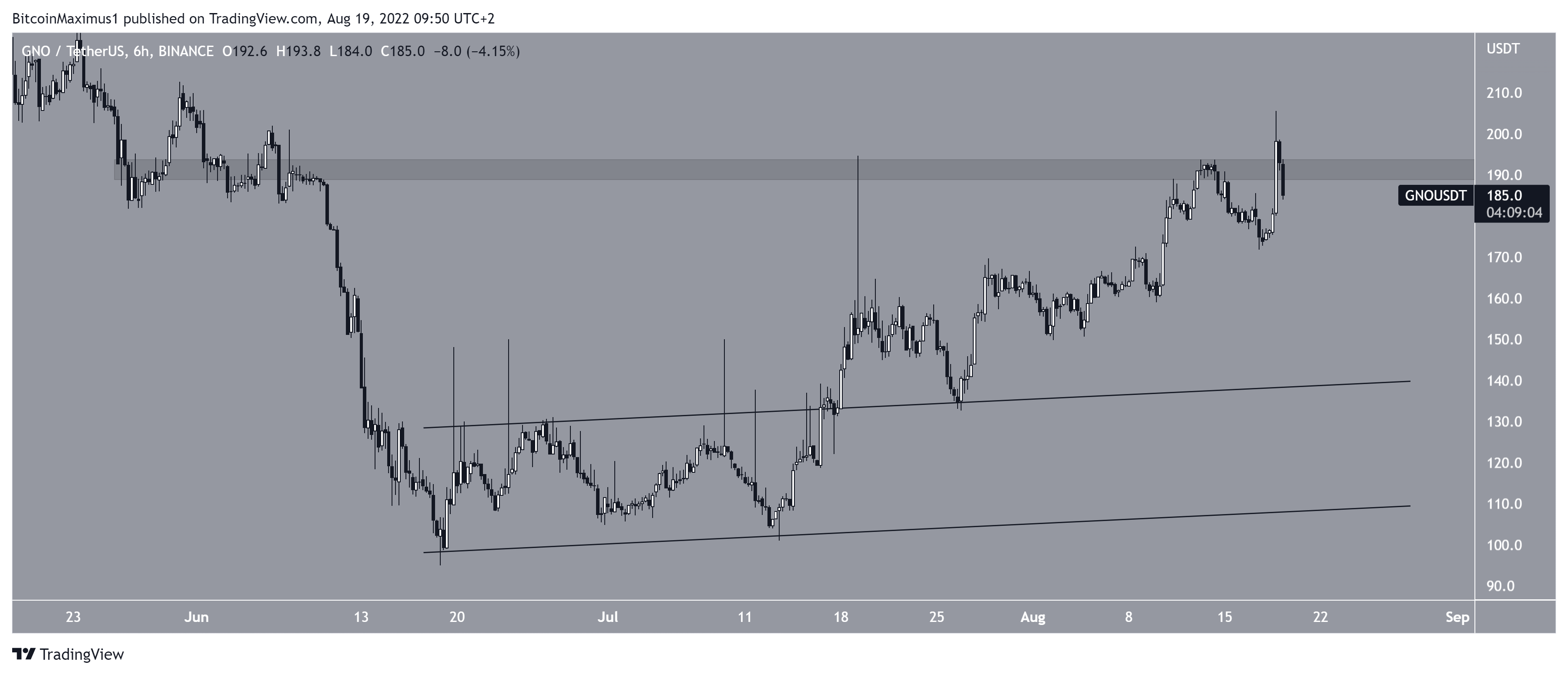 Vào ngày 17 tháng 7, Gnosis (GNO) đã bứt phá khỏi đường hỗ trợ tăng dần đã có từ ngày 18 tháng 6. Nó quay trở lại xác nhận mức này là hỗ trợ vào ngày 26 tháng 7. Giá đã tăng lên kể từ đó và đạt mức cao là 205 USD vào ngày 18 tháng 8. GNO đã bị từ chối sau đó và đã giảm dần kể từ đó. Có khả năng nó sẽ quay trở lại đường kháng cự của kênh.