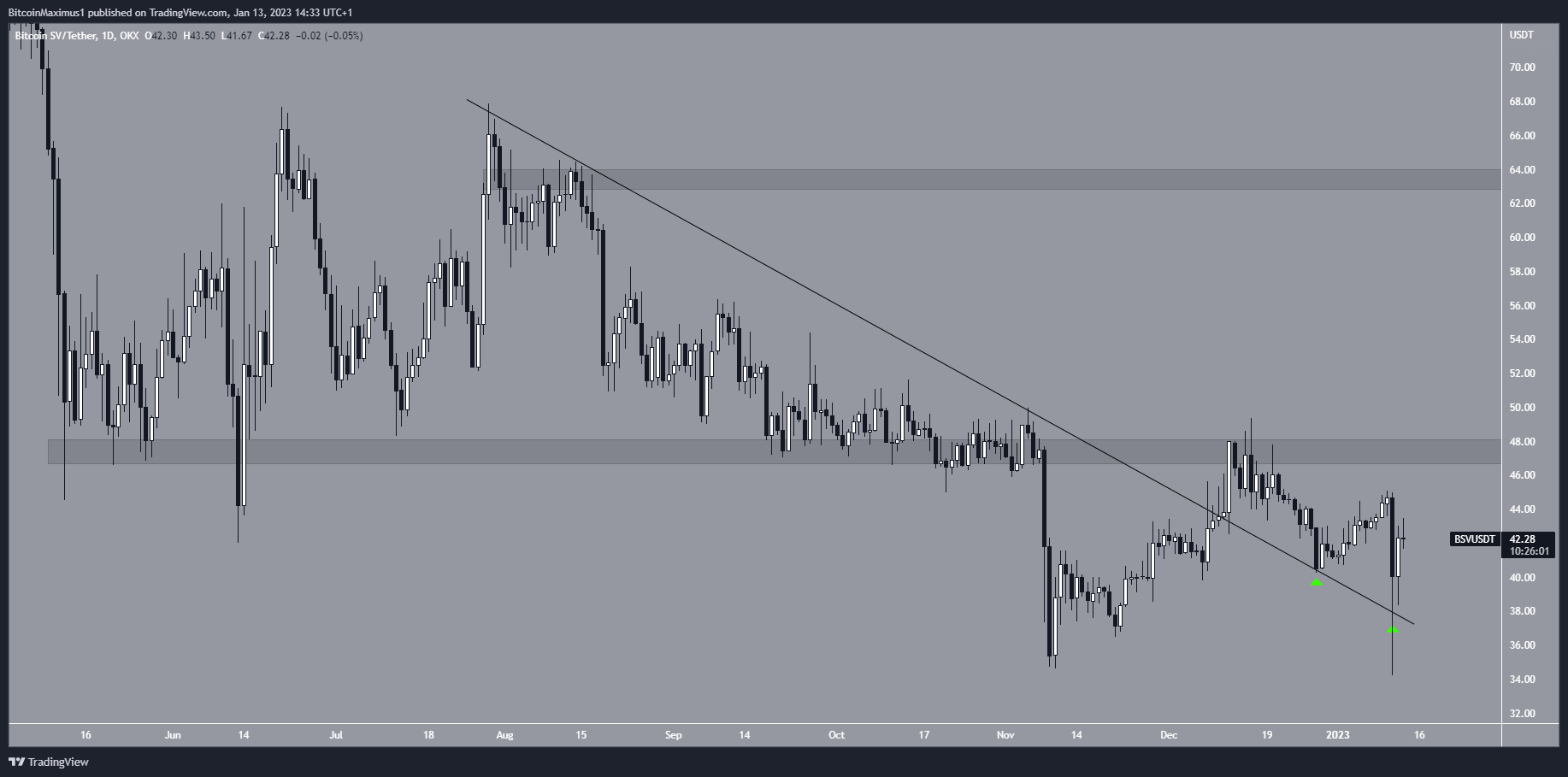 Giá BSV đã phá vỡ ngưỡng kháng cự giảm dần vào ngày 11/12 nhưng không thể vượt lên trên vùng kháng cự 47.5 USD. Tiếp theo, giá đã giảm và xác nhận đường kháng cự này hai lần, lần lượt vào ngày 28/12 và ngày 11/1 (biểu tượng màu xanh lục). Trong lần thứ hai, giá tạo một cây nến với chân dài rút râu bên dưới, được coi là dấu hiệu của áp lực mua. 2 ngày trước, BeInCrypto đã đưa tin về việc giá BSV giảm 10% khi tin tức bị huỷ niêm yết trên Robinhood. Những động thái này đã xếp BSV vào danh sách những Altcoin tăng thấp nhất tuần.
