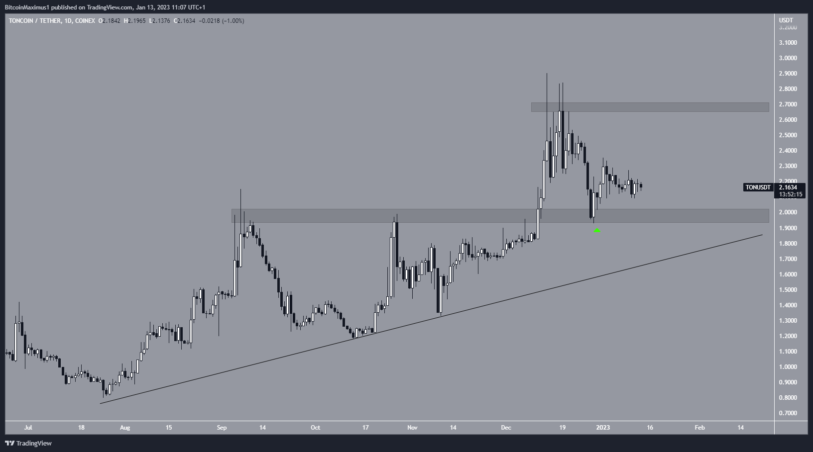 Vào ngày 29/12, Altcoin này đã bật lên tại khu vực 2 USD, xác nhận nó là hỗ trợ và bắt đầu đợt tăng giá hiện tại. Nếu giá TON đóng nến dưới vùng hỗ trợ 2 USD, thì nó có thể giảm xuống đường hỗ trợ tăng dần ở mức 1.8 USD. Mặt khác, nếu đà tăng tiếp tục, ngưỡng kháng cự gần nhất tiếp theo sẽ là 2.7 USD.