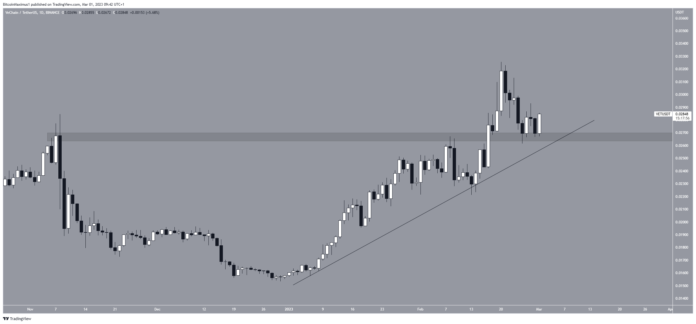 Giá VET đã tăng cùng với đường hỗ trợ tăng dần kể từ tháng 1/2023. Chuyển động đi lên đã dẫn đến mức cao 0.033 USD vào ngày 20 tháng 2. Mặc dù giá đã giảm sau đó, nhưng nó vẫn đang giao dịch trên đường hỗ trợ tăng dần tại 0.027 USD. Do đó, xu hướng giá VET được coi là tăng và dự kiến sẽ lên tới 0.040 USD. Tuy nhiên, nếu giá rơi khỏi đường hỗ trợ tăng dần này, nó có thể giảm xuống 0.020 USD.