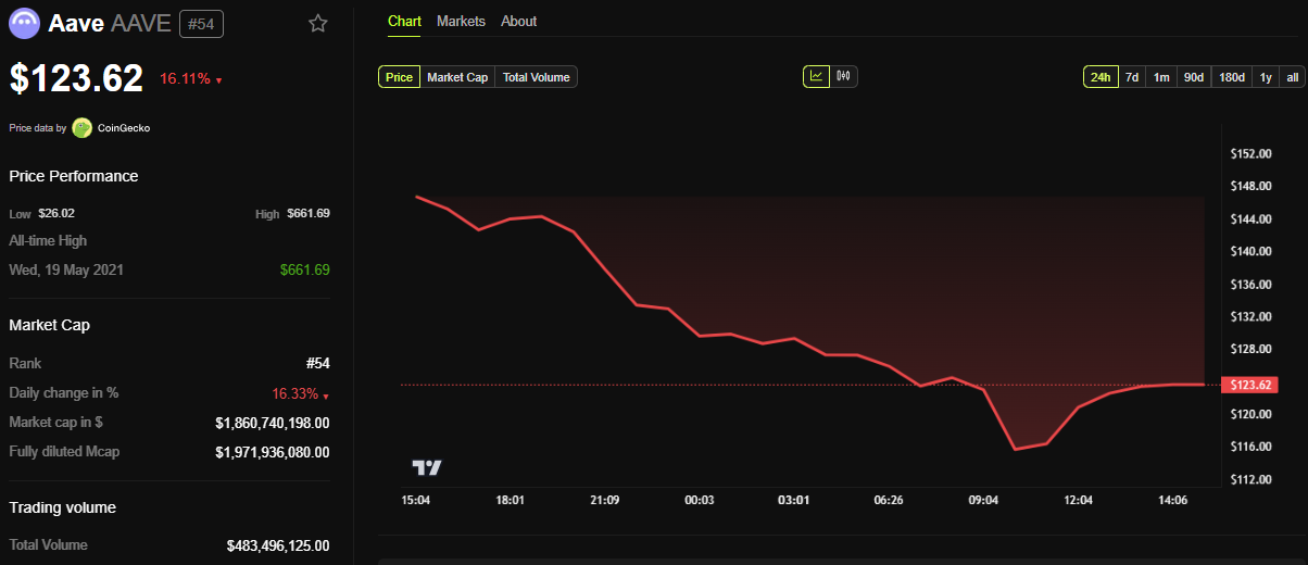 Sponsored SponsoredDữ liệu từ BeInCrypto cho thấy token AAVE đang giao dịch ở mức 123.62 USD tại thời điểm viết bài, giảm hơn 16% trong 24 giờ qua.