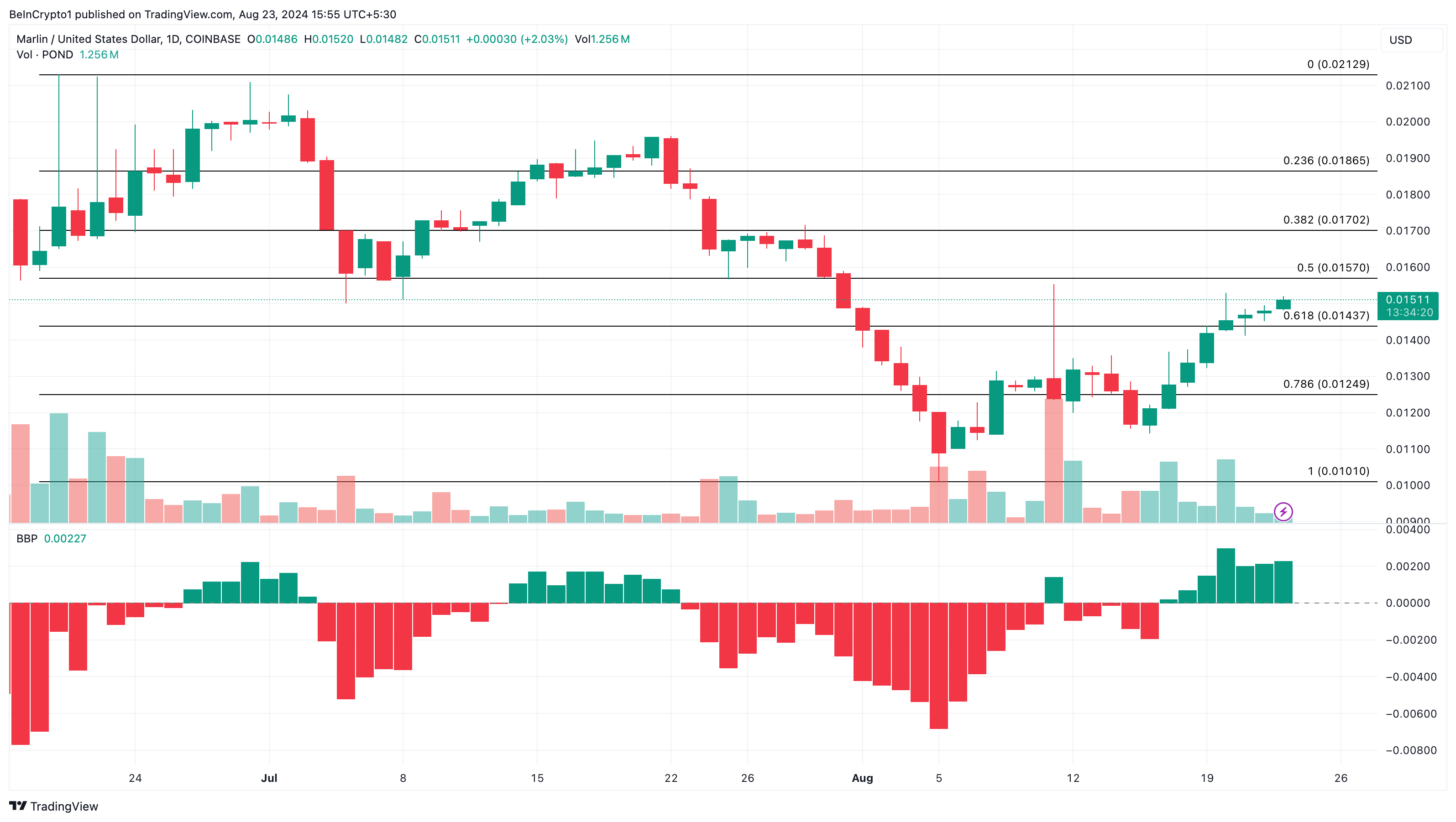 SponsoredTừ hình ảnh dưới đây, chúng ta quan sát thấy chỉ số BBP ở vùng dương. BBP đo khả năng của người bán kéo giá xuống hoặc sức mạnh của người mua trong việc nâng giá trị tiền mã hóa lên. Nếu chỉ số là âm, phe bán đang kiểm soát và giá có thể giảm. Tuy nhiên, một chỉ số dương, như trường hợp của POND, cho thấy phe mua đang thống trị. Do đó, nếu điều này tiếp tục, giá của token tiện ích Marlin có thể tăng lên 0.017 USD.
