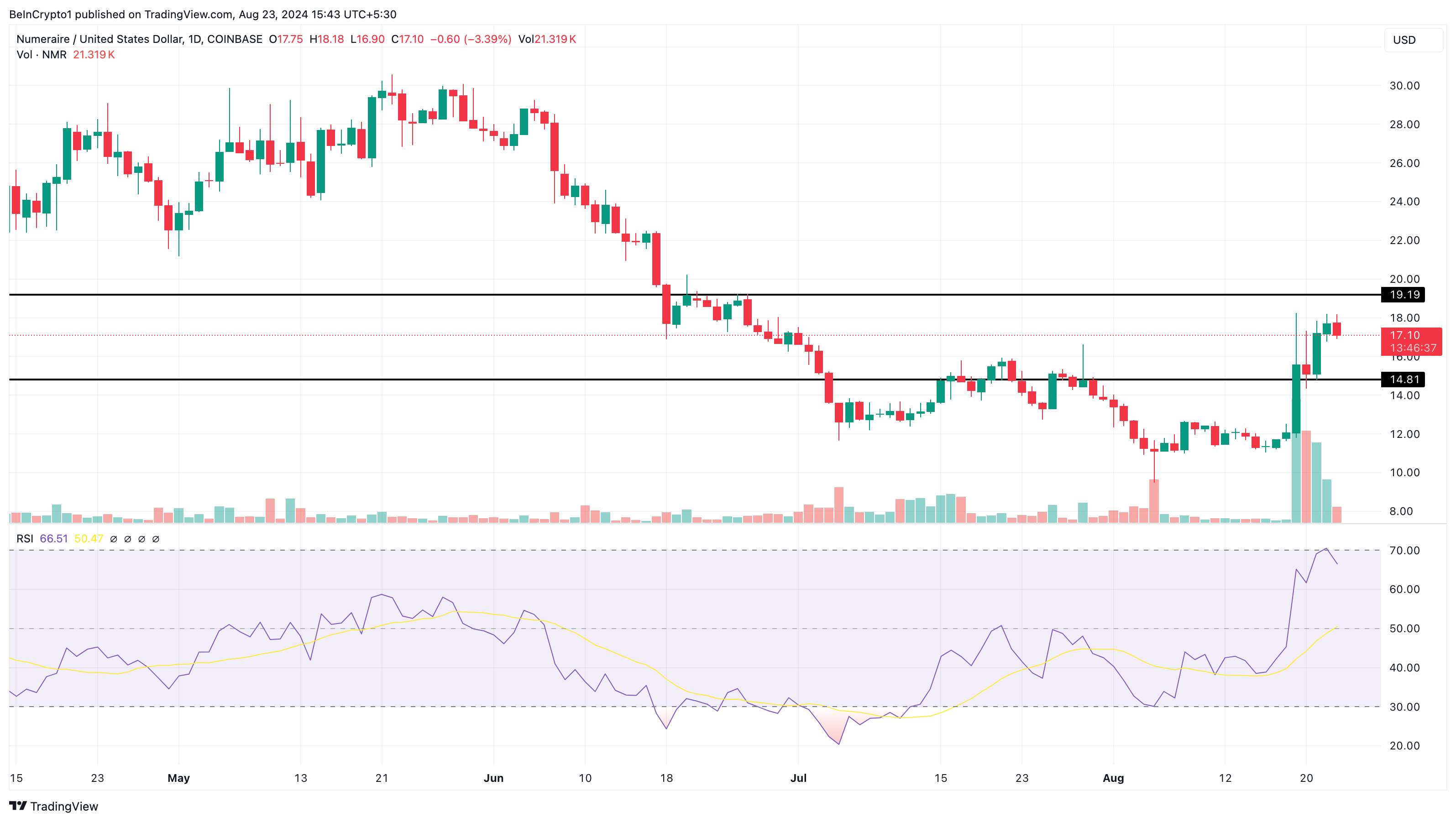 Vào ngày 05/08, giá của NMR dưới 10 USD và chỉ số sức mạnh tương đối (RSI) của nó đã chỉ ra tình trạng bán quá mức. Thông thường, chỉ số RSI dưới 30.00 cho thấy tình trạng bán quá mức, trong khi chỉ số trên 70.00 cho thấy mức mua quá mức. Như hình dưới đây, RSI đã tăng khi động lực mua tăng lên, góp phần vào sự nhảy vọt của giá token.