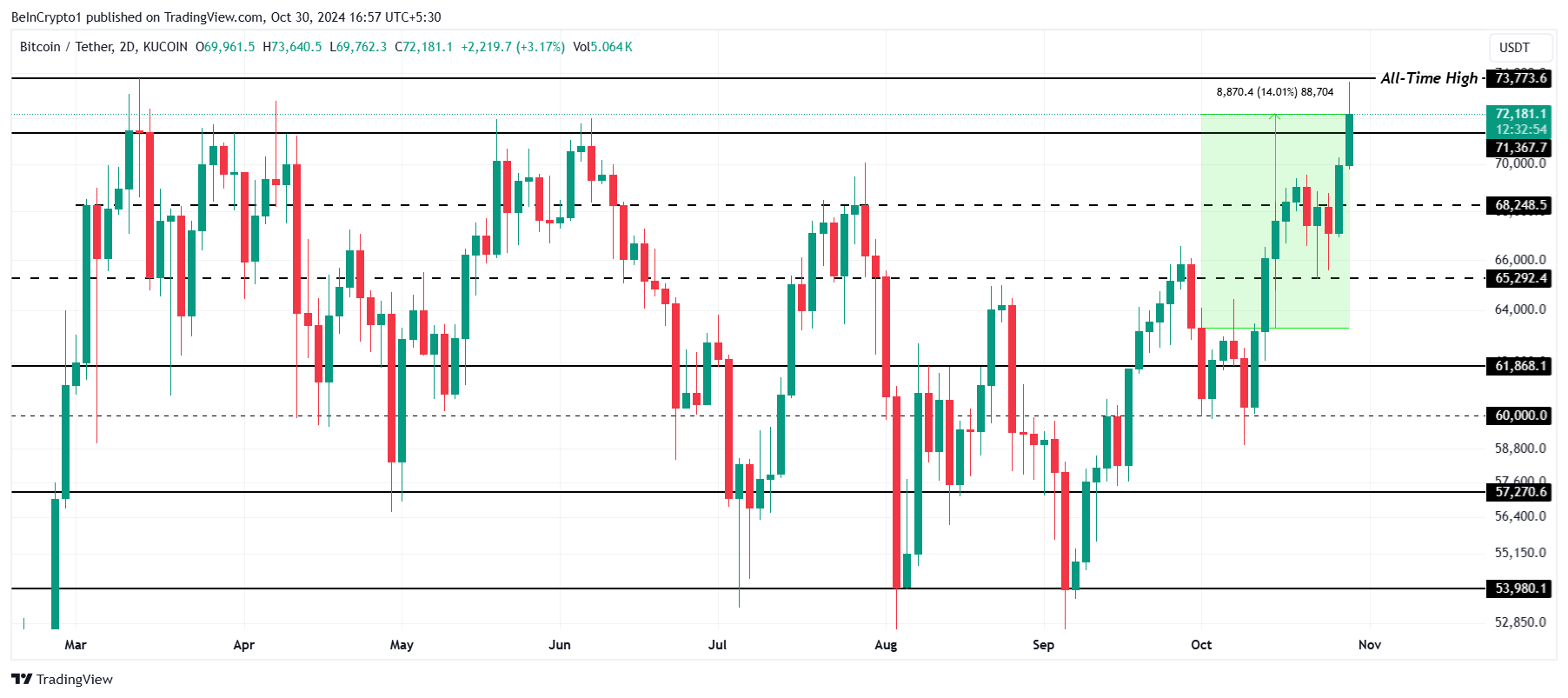 Giá Bitcoin đang ở ngưỡng vượt qua mức kháng cự 73,800 USD và hình thành một đỉnh cao mới mọi thời đại. Vua tiền điện tử hiện đang giao dịch ở mức 72,181 USD sau khi tăng 14% trong suốt tháng 10. Một trong những yếu tố thúc đẩy lớn nhất cho Bitcoin sẽ là dòng tiền vào ETF BTC giao ngay và điều này đã được Juan Pellicer, Nhà nghiên cứu cấp cao tại IntoTheBlock, nhấn mạnh trong một trích dẫn độc quyền cho BeInCrypto.
