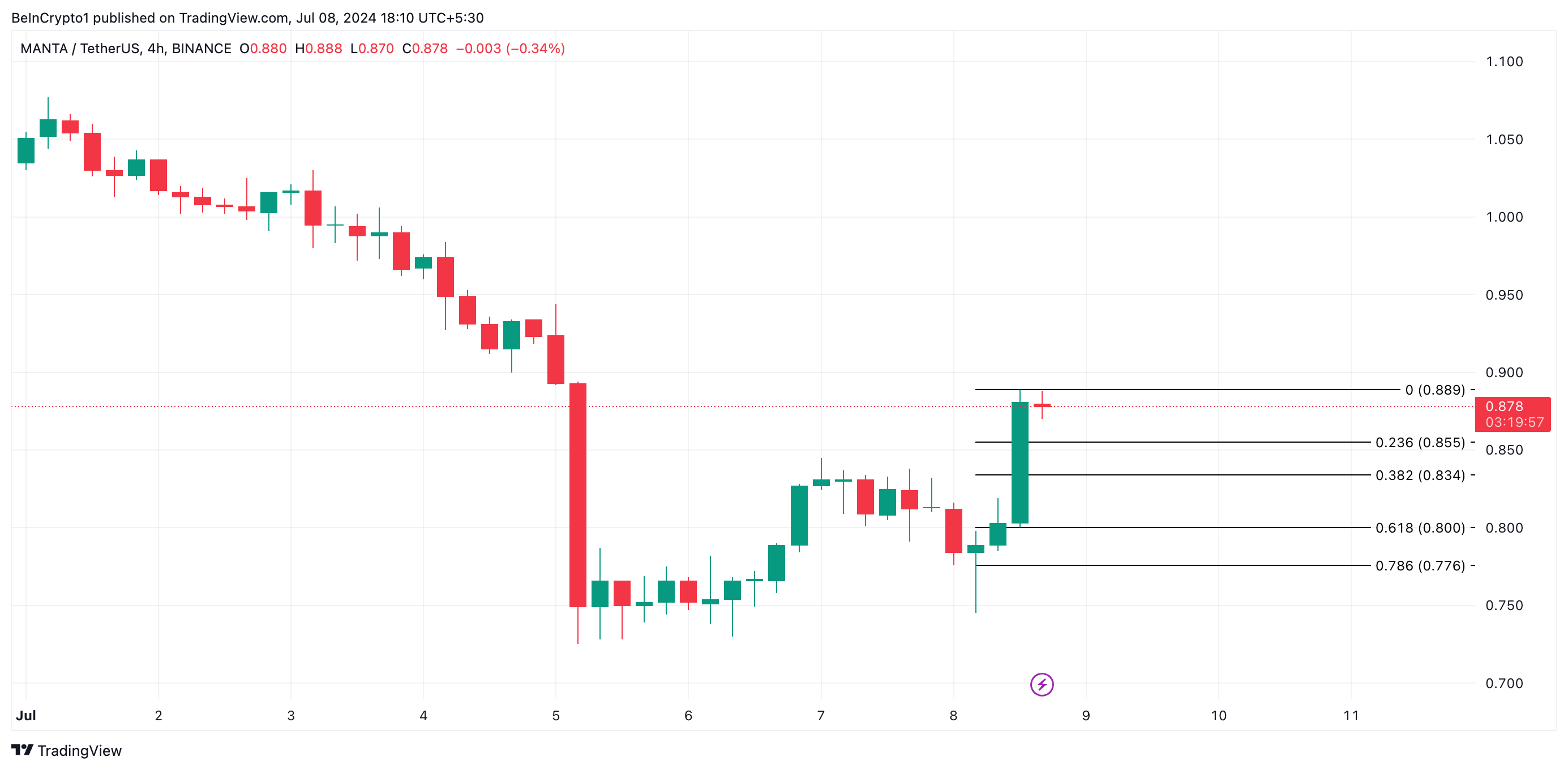 Giá trị của MANTA, token bản địa điều khiển Manta Network, đã tăng gần 7% trong 24 giờ qua. Nó được xếp hạng là token L2 có mức tăng trưởng nhiều nhất trong khoảng thời gian đó. Sự tăng giá của token đã dẫn đến một đợt tăng trong hoạt động của thị trường phái sinh của nó. Trong khoảng thời gian được xem xét, khối lượng giao dịch trên thị trường phái sinh của MANTA đã tăng hơn 30%. Trong 24 giờ qua, con số này đã đạt 87 triệu USD.