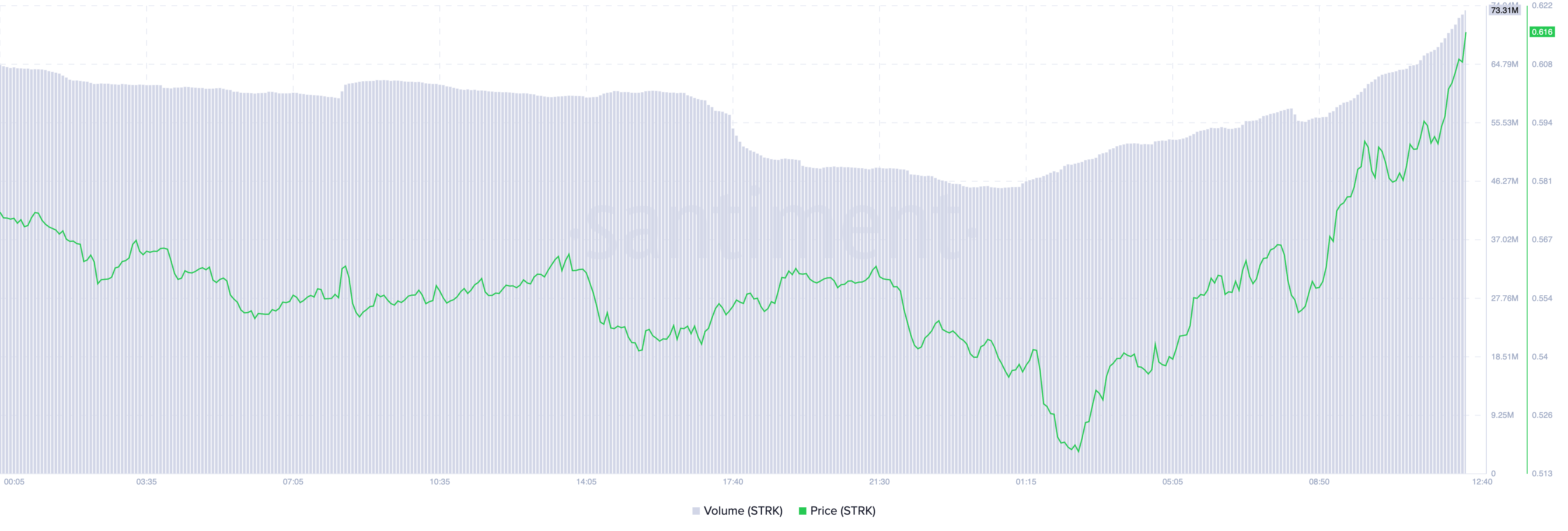 Starknet (STRK) hiện đang được giao dịch ở mức 0.60 USD tại thời điểm viết bài. Giá của Altcoin này đã tăng 9% trong 24 giờ qua. Mức tăng giá này đi kèm với sự bùng nổ về khối lượng giao dịch hàng ngày. Tại thời điểm viết bài, khối lượng giao dịch hàng ngày của Altcoin này đã tăng 30%, đạt 75 triệu USD.