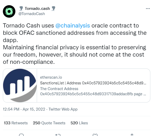 Theo đó, đây được coi là một nỗ lực của Giao thức này trong việc bắt đầu tuân thủ các lệnh trừng phạt của Hoa Kỳ. Đại diện của dự án đã thông báo điều này trên trang Twitter chính thức của Tornado Cash. Theo thông báo, dự án sẽ dựa trên dữ liệu của Chainalysis để theo dõi các địa chỉ bị xử phạt.