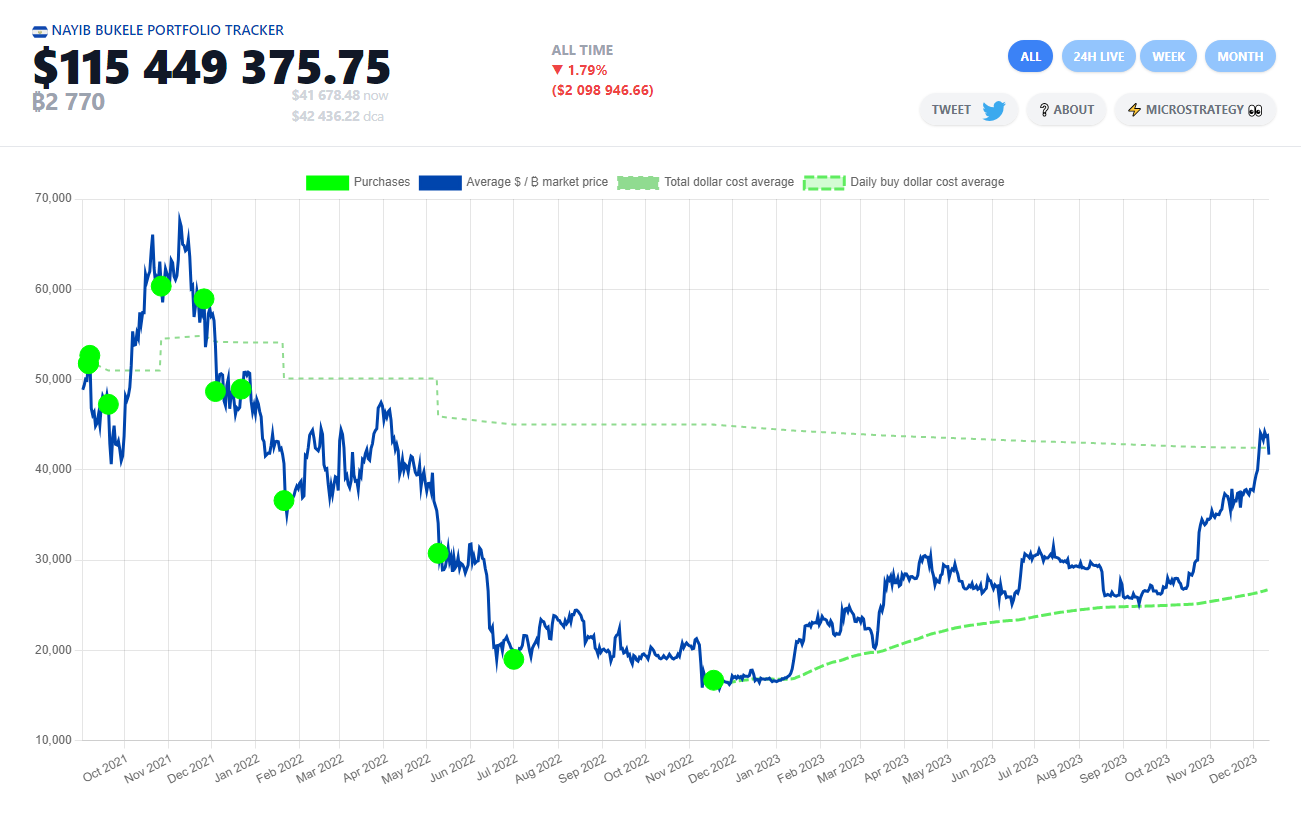 Như BeInCrypto đã đưa tin trước đó, Nayib Bukele đã mua BTC từ tháng 9/2021. Tính đến thời điểm hiện tại, quốc gia này hiện nắm giữ 2,770 BTC trị giá khoảng 115 triệu USD. Tuy nhiên, nhiều giao dịch mua BTC của Tổng thống Bukele đã diễn ra trong đợt tăng giá khiến mức giá đầu vào khá cao. Kết quả là danh mục đầu tư của El Salvador đã chìm trong sắc đỏ trong suốt hai năm qua.