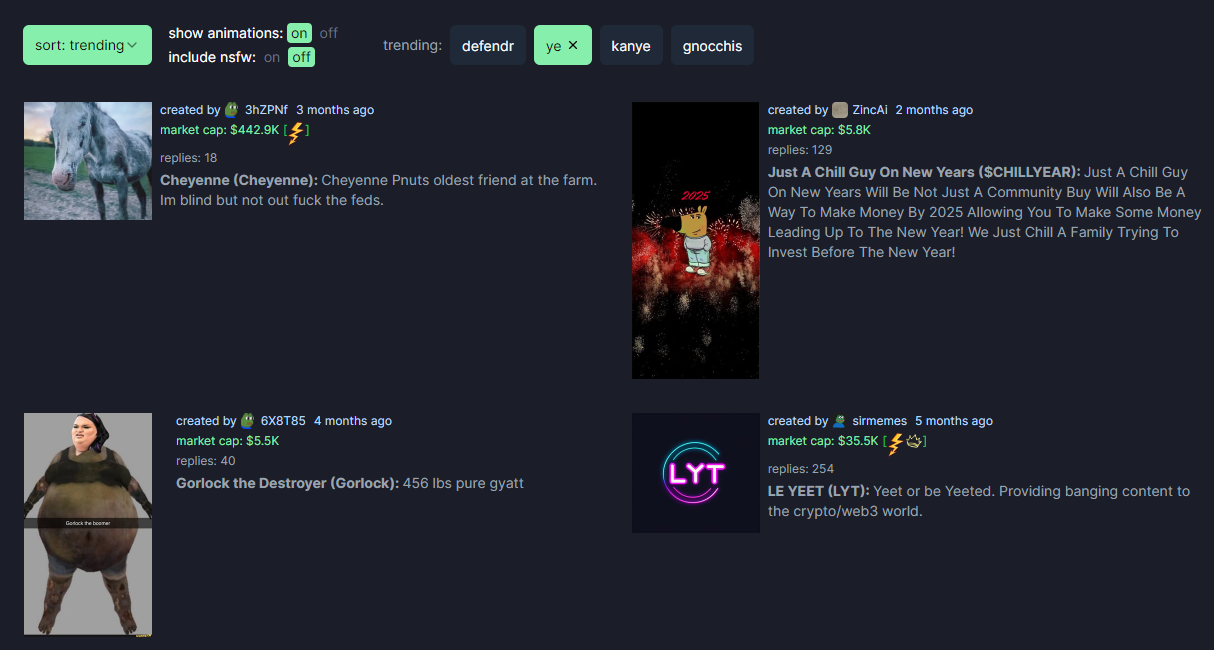 Tính đến thời điểm BeInCrypto viết bài này, nhiều phiên bản giả mạo của đồng coin này đã xuất hiện và trở thành xu hướng trên Pump Fun. Theo đó, những meme coin này lấy các tên như “Ye”, “Kanye” hay “West” ăn theo tên của nam rapper này. Dưới sức ảnh hưởng của West, nhiều Kanye West meme coin trong số đó vẫn ghi nhận giá trị tăng đáng kể. Trong quá khứ, các meme coin liên quan đến những người nổi tiếng như Caitlyn Jenner và Iggy Azalea cũng đã tăng giá nhanh chóng và đương nhiên cũng giảm mạnh ngay sau đó.