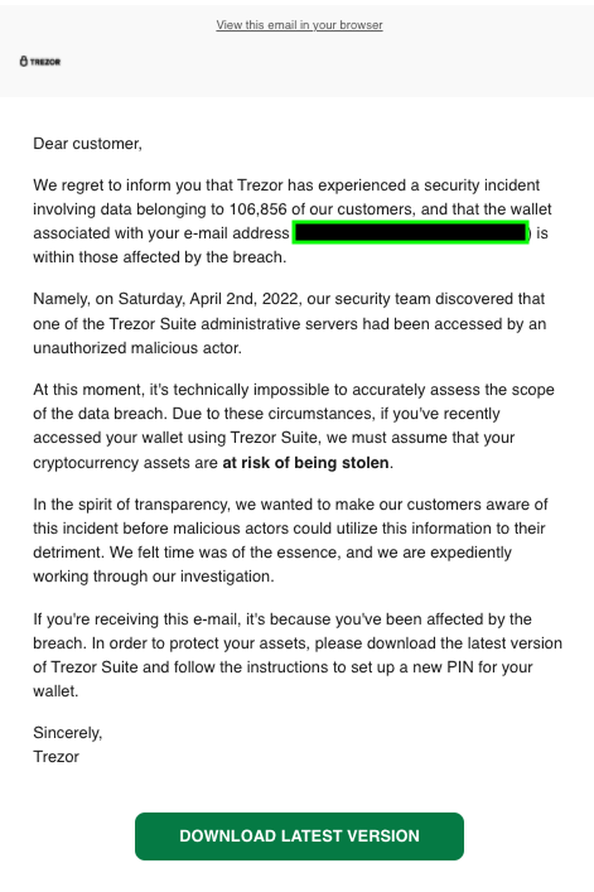 Sponsored Sponsored“Tại thời điểm này, về mặt kỹ thuật không thể đánh giá chính xác mức độ vi phạm dữ liệu. Do những trường hợp này, nếu gần đây bạn đã truy cập ví của mình bằng Trezor Suite, chúng tôi phải giả định rằng tài sản tiền điện tử của bạn có nguy cơ bị đánh cắp. ”