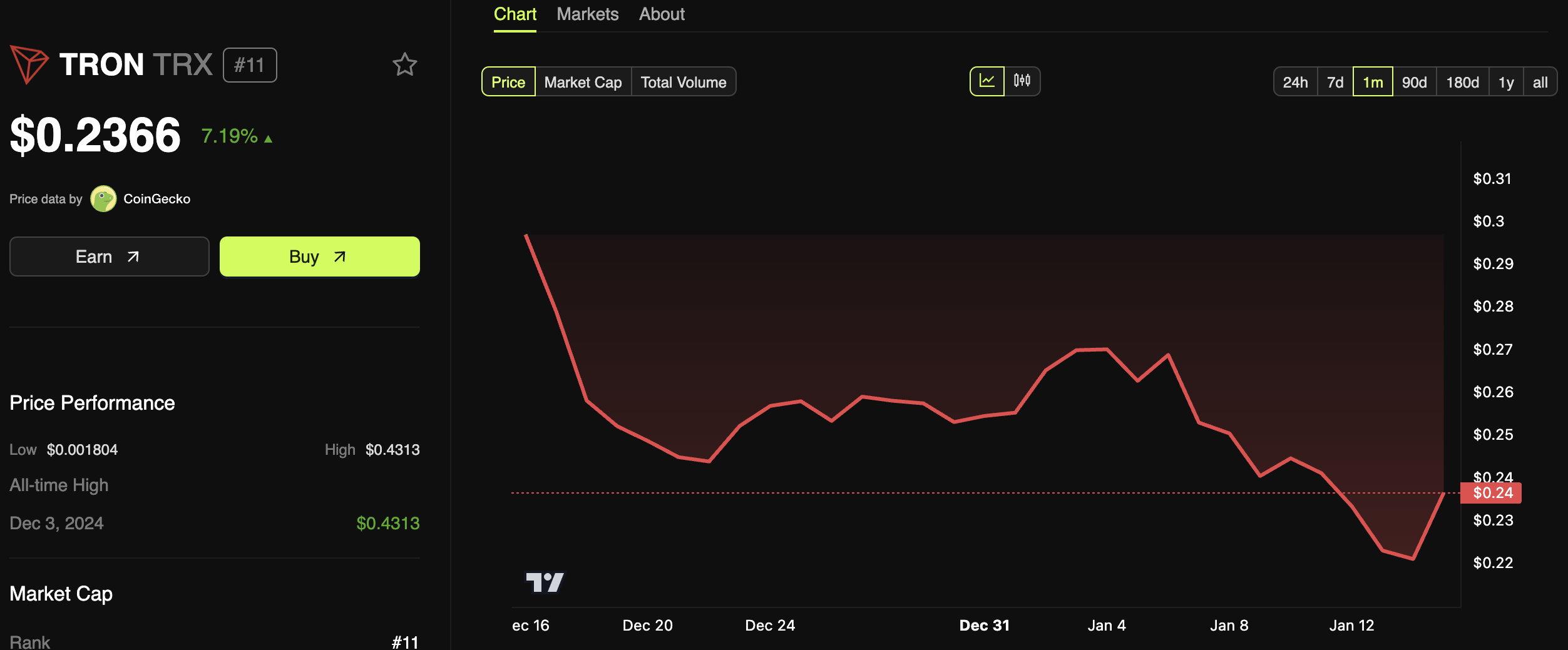 Token gốc của Tron TRX đã đạt mức cao nhất mọi thời đại khoảng một tháng trước, nhưng sự biến động của nó có thể không đủ bền vững để hỗ trợ một stablecoin. Thực tế, TRX đã chịu sự suy giảm ổn định trong những tuần qua, mặc dù các nhà đầu tư tận tâm vẫn đang thể hiện sự kiên cường.