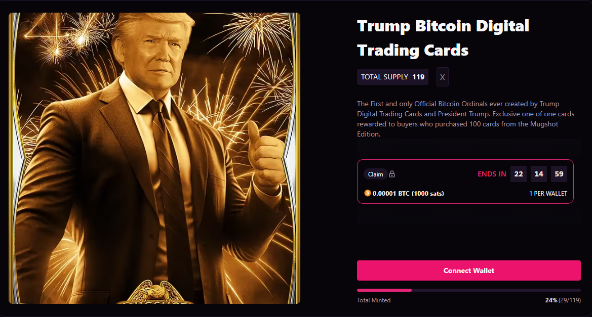 Bộ sưu tập NFT mới nhất của Donald Trump, có tên là “Trump Bitcoin Digital Trading Cards,” đã ra mắt lô đầu tiên gồm 160 sản phẩm trên mạng Bitcoin sử dụng giao thức Ordinals.