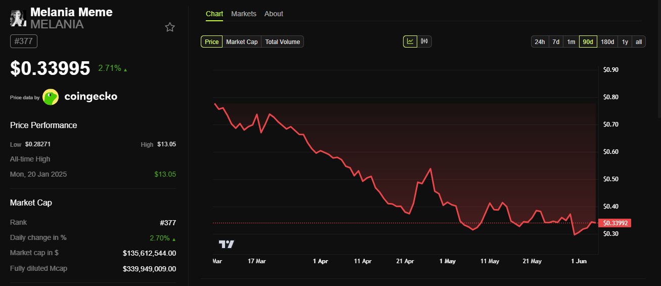 Mặc dù vậy, MELANIA vẫn ghi nhận sự giảm mạnh từ mức ATH trước đó. Giá hiện tại đã giảm hơn 97% so với ngày 20/01.