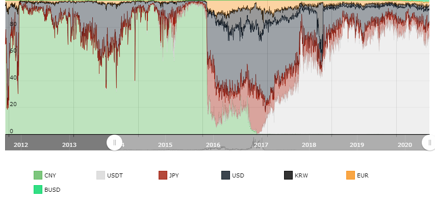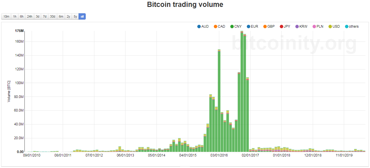 Một trong số những sàn giao dịch tiền kỹ thuật số lớn nhất ngày nay, bao gồm Huobi và Binance đã được thành lập và đặt trụ sở tại Trung Quốc. Tại một thời điểm trong năm 2014, các báo cáo cho thấy, đồng Nhân dân tệ của Trung Quốc đã chiếm ít nhất 71% tổng số giao dịch Bitcoin trên phạm vi toàn cầu.