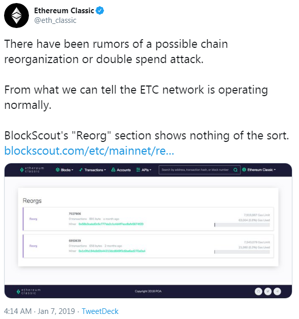 “Có những đồn đại về khả năng tái tổ chức lại chuỗi hoặc tấn công chi tiêu kép. Những gì chúng tôi có thể nói là mạng lưới ETC vẫn đang hoạt động bình thường.”