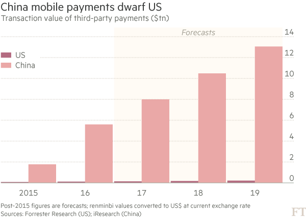 Theo một báo cáo của American Express, cơ sở hạ tầng thanh toán di động của Trung Quốc gấp gần 50 lần giá trị của thị trường Mỹ. Một phần lớn của tăng trưởng này có thể được cho là nhờ vào các doanh nghiệp nội địa như WeChat và AliPay, với tổng thị phần hơn 90%.