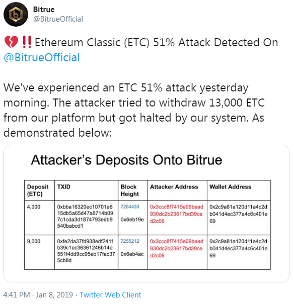 “Cuộc tấn công 51% vào Ethereum Classic (ETC) đã được phát hiện trên @BitrueOfficial. Chúng tôi vừa trải qua một tấn công 51% vào sáng hôm qua. Kẻ tấn công đã rút đi 13.000 ETC từ nền tảng của chúng tôi, mà bị ngăn chặn lại bởi hệ thống của chúng tôi.”