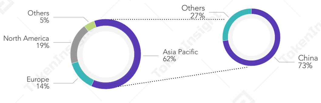 Năm 2015, một nửa trong số các thợ đào trên mạng lưới Bitcoin được cho là phân bố đâu đó ở Trung Quốc, nằm dưới 4 mỏ khai thác khác nhau. Một báo cáo của Reuter tiết lộ, vào năm 2019, các thợ đào Trung Quốc đã kiểm soát tới 66% hashrate toàn cầu của Bitcoin.