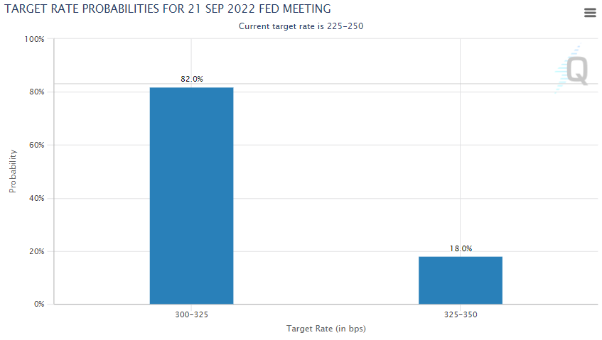 Theo ghi nhận của BeInCrypto từ khảo sát của CME Group, 82% người được khảo sát tin rằng FED sẽ tăng lãi xuất thêm 0.75%. 18% còn lại dự đoán sẽ tăng thêm 1%.
