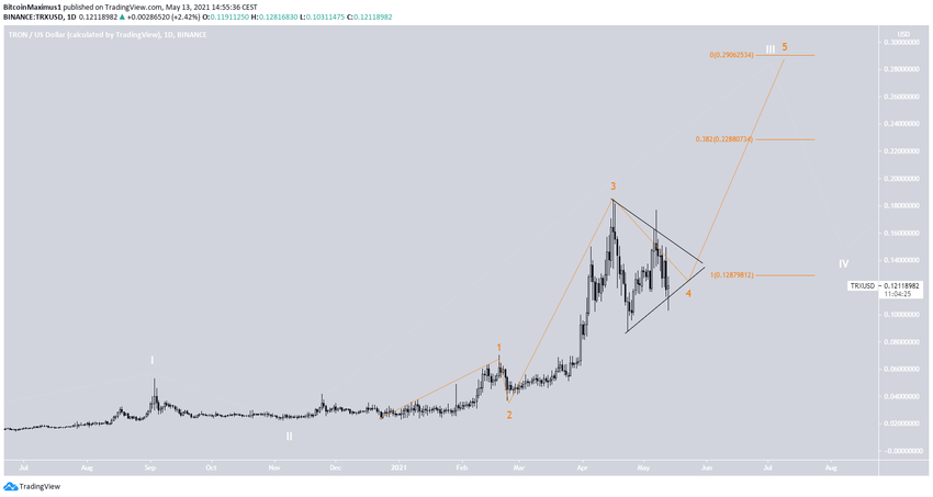 Dựa vào số lượng sóng, TRX có khả năng chỉ vừa bắt đầu sóng phụ thứ năm và cuối cùng của làn sóng thứ ba trong dài hạn (màu trắng).