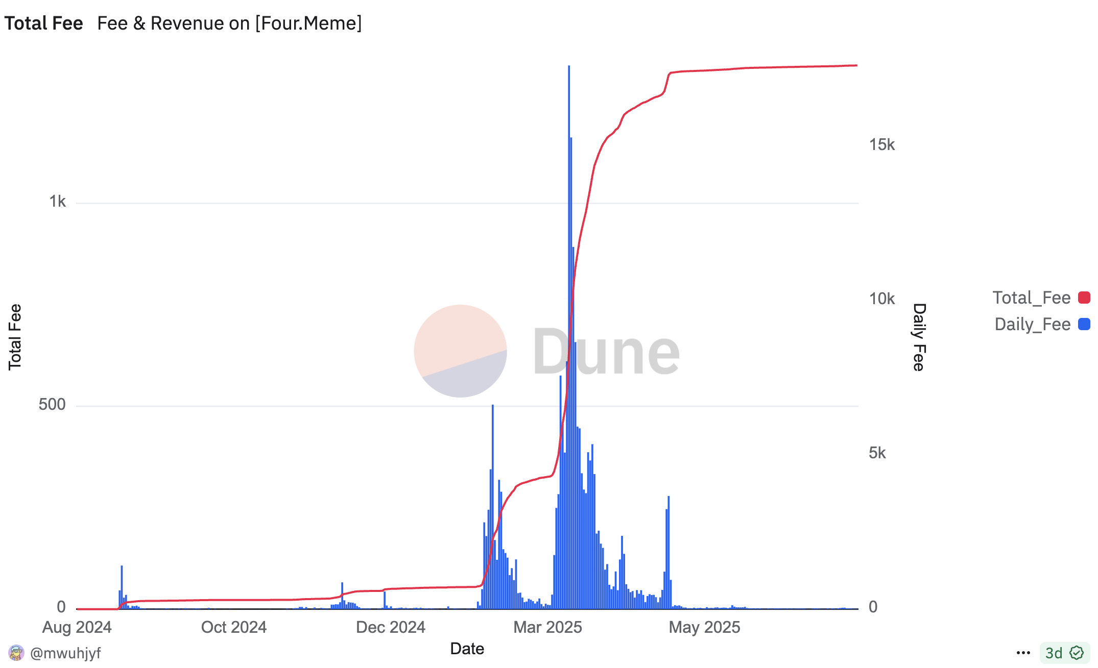 Trong khi đó, đợt giảm giá diễn ra trong bối cảnh sự chậm lại rộng hơn trong hệ sinh thái Four.Meme. Dữ liệu từ Dune Analytics tiết lộ rằng phí hàng ngày đã liên tục giảm trong những tháng qua.