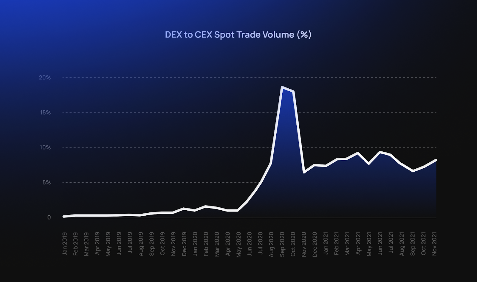 - Từ tháng 8 năm 2020 đến năm 2021, giá trị giao dịch trên các sàn giao dịch phi tập trung lớn (DEX), như Curve, Uniswap và PancakeSwap đã tăng khoảng 550%.