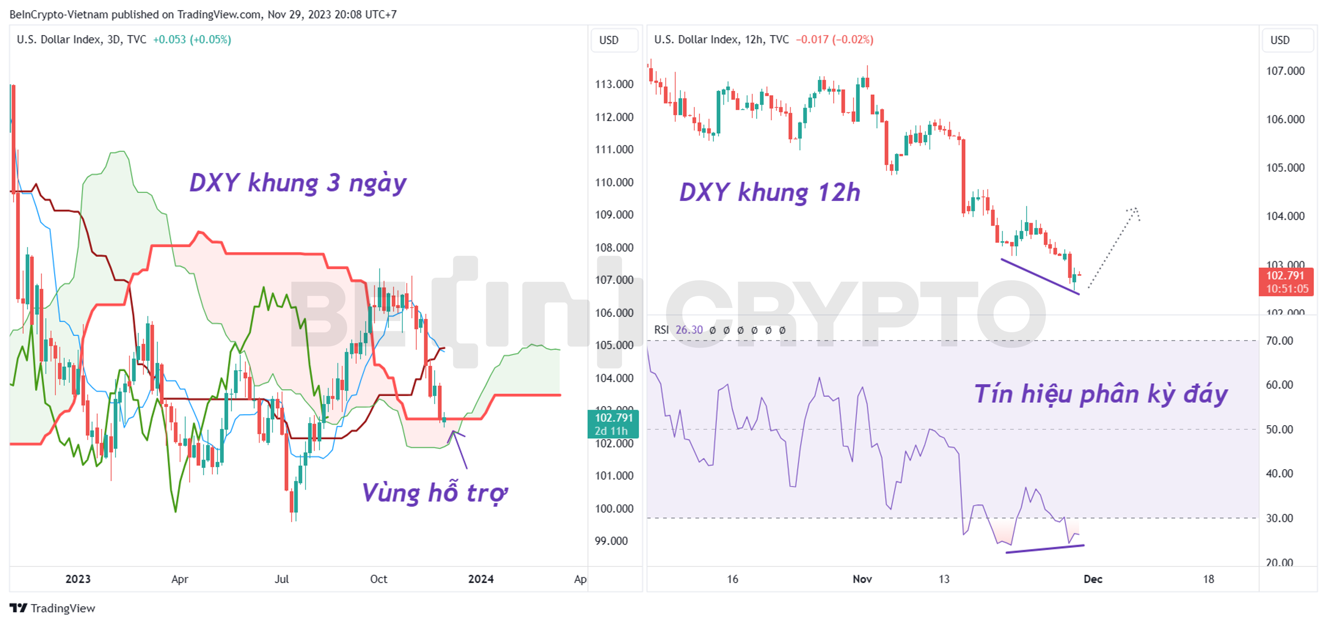 - Trong khung 12h, biến động của DXY đã tạo nên tín hiệu phân kỳ đáy dự báo DXY sẽ phục hồi trong tháng 12. Target của đà phục hồi này có thể là vùng 104 điểm.