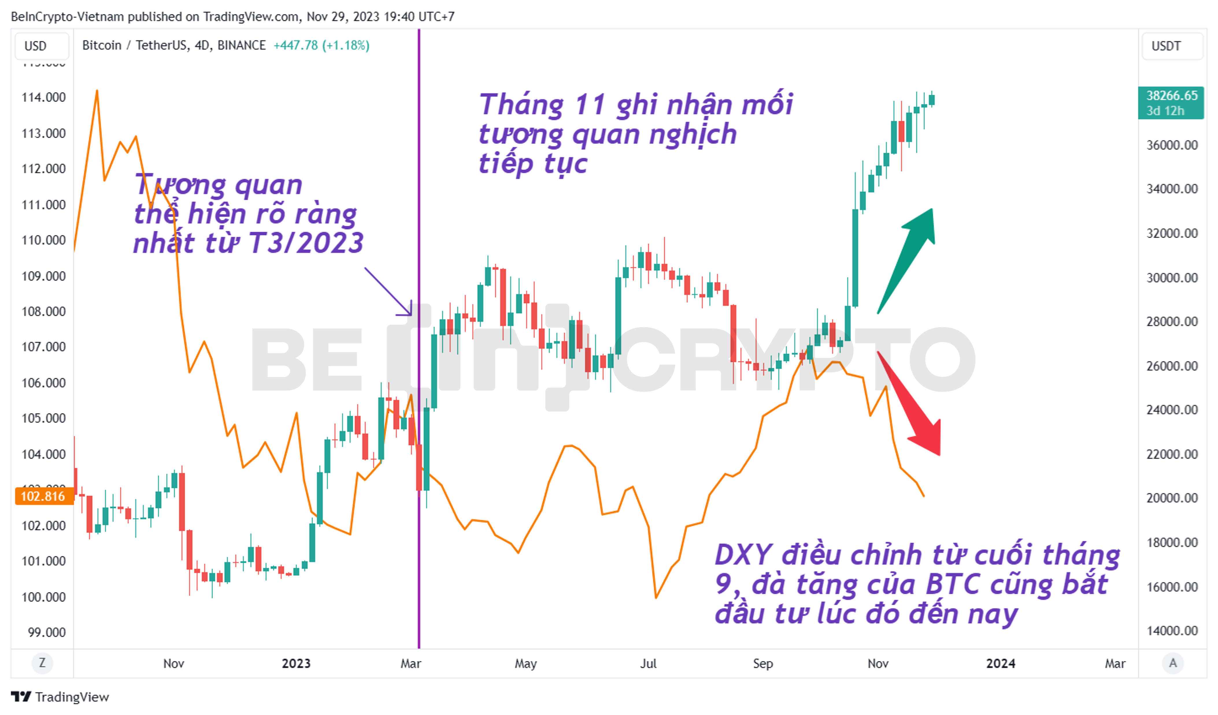 Trong tháng 11 này, những phân tích tương quan giữa giá Bitcoin và chỉ số sức mạnh đồng USD (DXY) ít được chú trọng. Hay có thể nhận định, những tin tức về Bitcoin ETF giao ngay và sự kiện CZ nhận tội rồi từ chức, đã xóa nhòa những quan tâm khác của nhà đầu tư.