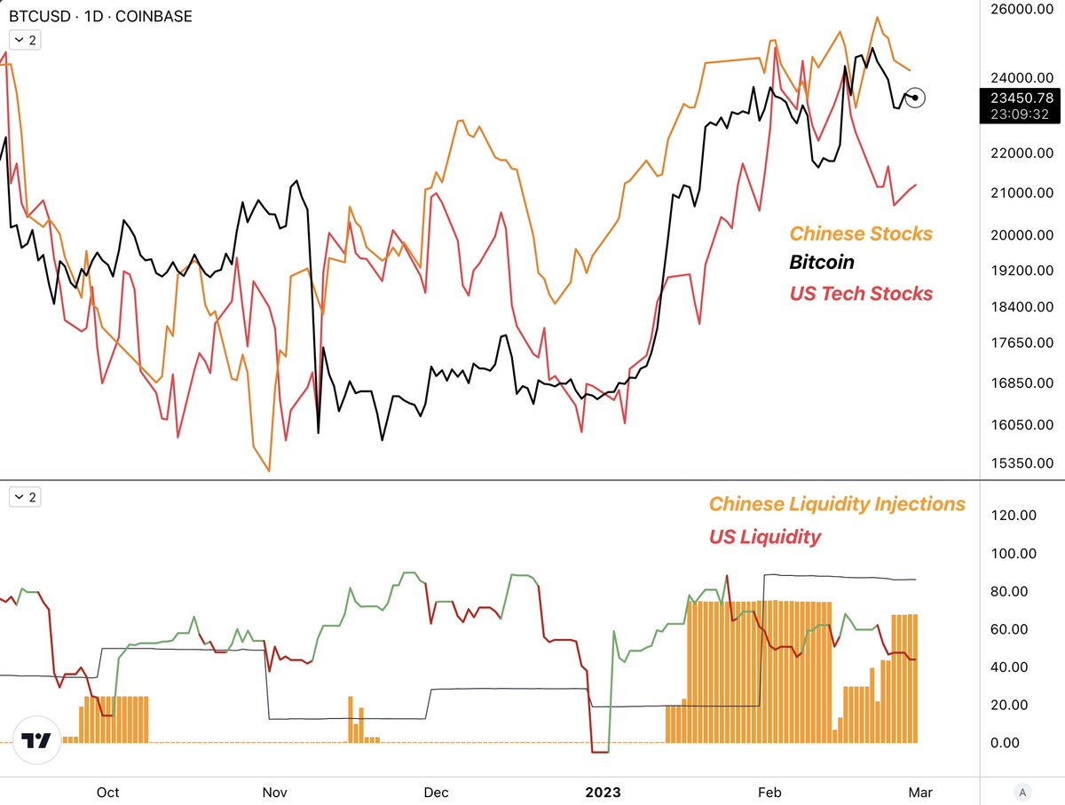 Trong khi giá BTC mất tương quan với chính sách thắt chặt tiền tệ của FED trong tháng 2 vừa qua, thì việc Trung Quốc bơm thêm tiền vào lưu thông lại “trùng hợp” với đà phục hồi của Bitcoin. Có thể những kết luận về tương quan giữa Bitcoin và chính sách tiền tệ Trung Quốc là còn sớm, nhưng nó đã là một dấu hiệu đáng theo dõi thời gian tới.