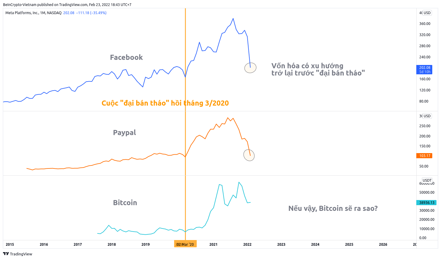 - Sử dụng thời điểm “đại bán tháo” làm cột mốc cho động thái “in tiền” của FED và nhiều chính phủ, thì có thể thấy sau khi đại dịch đã được “bình thường hóa”, vốn hóa có xu hướng suy giảm về thời điểm trước cuộc “đại bán tháo” xảy ra. Facebook và Paypal đã đánh dấu mức suy giảm hơn một nửa, chưa từng có và chưa từng nhanh chóng như thế.