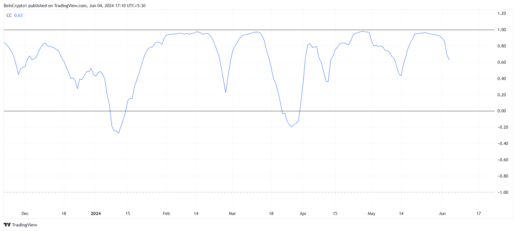 Thứ hai, mối tương quan giữa Solana và Bitcoin cũng đang giảm xuống. Sự sụt giảm trong mối tương quan thường được coi là một dấu hiệu giảm giá vì sự gia tăng của BTC cũng giúp Altcoin tăng lên. Tuy nhiên, hiện tại, sự cách biệt này lại là một lợi ích cho SOL. Lý do đằng sau điều này là các trường hợp lịch sử mà Altcoin tăng giá mỗi khi mối tương quan của nó với BTC giảm. Hiện tại, mối tương quan này đứng ở mức 0.63, giảm xuống thấp hơn.