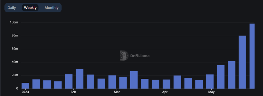 Theo dữ liệu của DeFillama, TVL tăng cũng trùng hợp với khối lượng DEX tăng. Cardano đã ghi nhận khối lượng giao dịch hàng tuần cao nhất trong ba tuần cuối tháng 5 khi tăng từ 41 triệu USD lên 98.26 triệu USD.