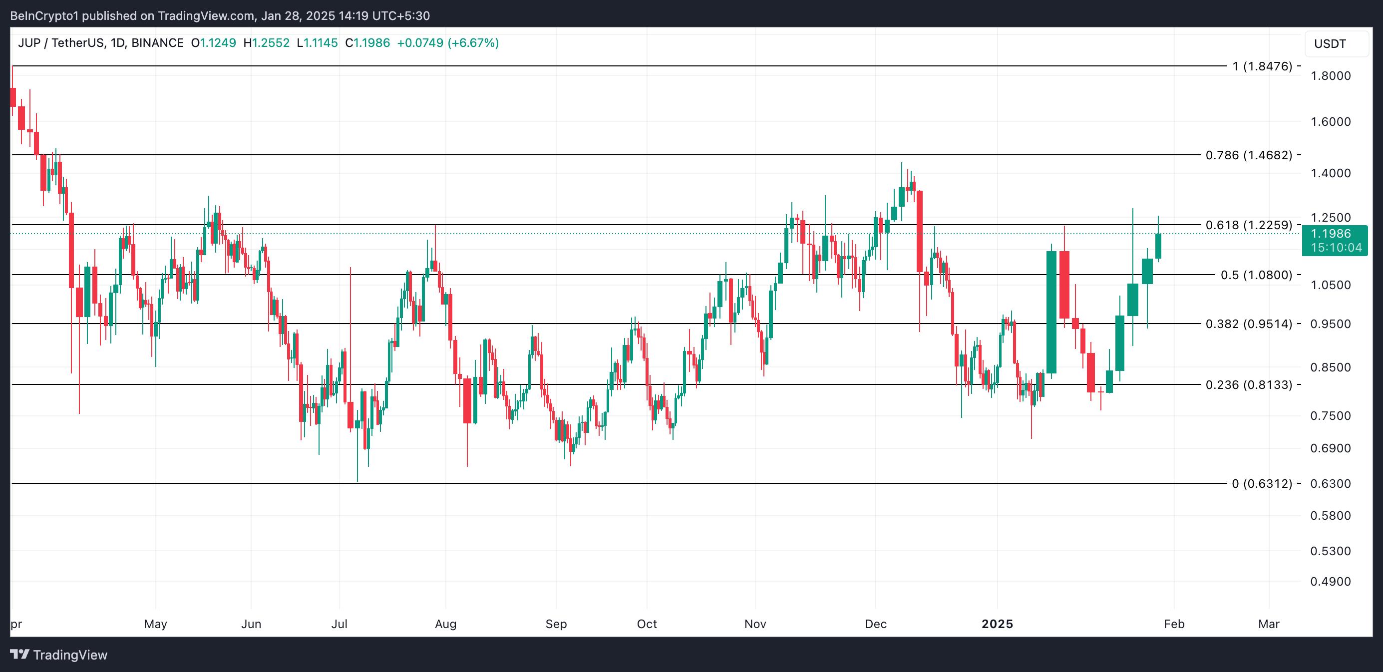 Tại thời điểm viết bài, JUP đang giao dịch ở mức 1.19 USD. Nếu nó tiếp tục chứng kiến sự gia tăng nhu cầu, điều này có thể đẩy giá trị của nó vượt qua ngưỡng kháng cự hình thành ở mức 1.22 USD và hướng tới 1.46 USD.
