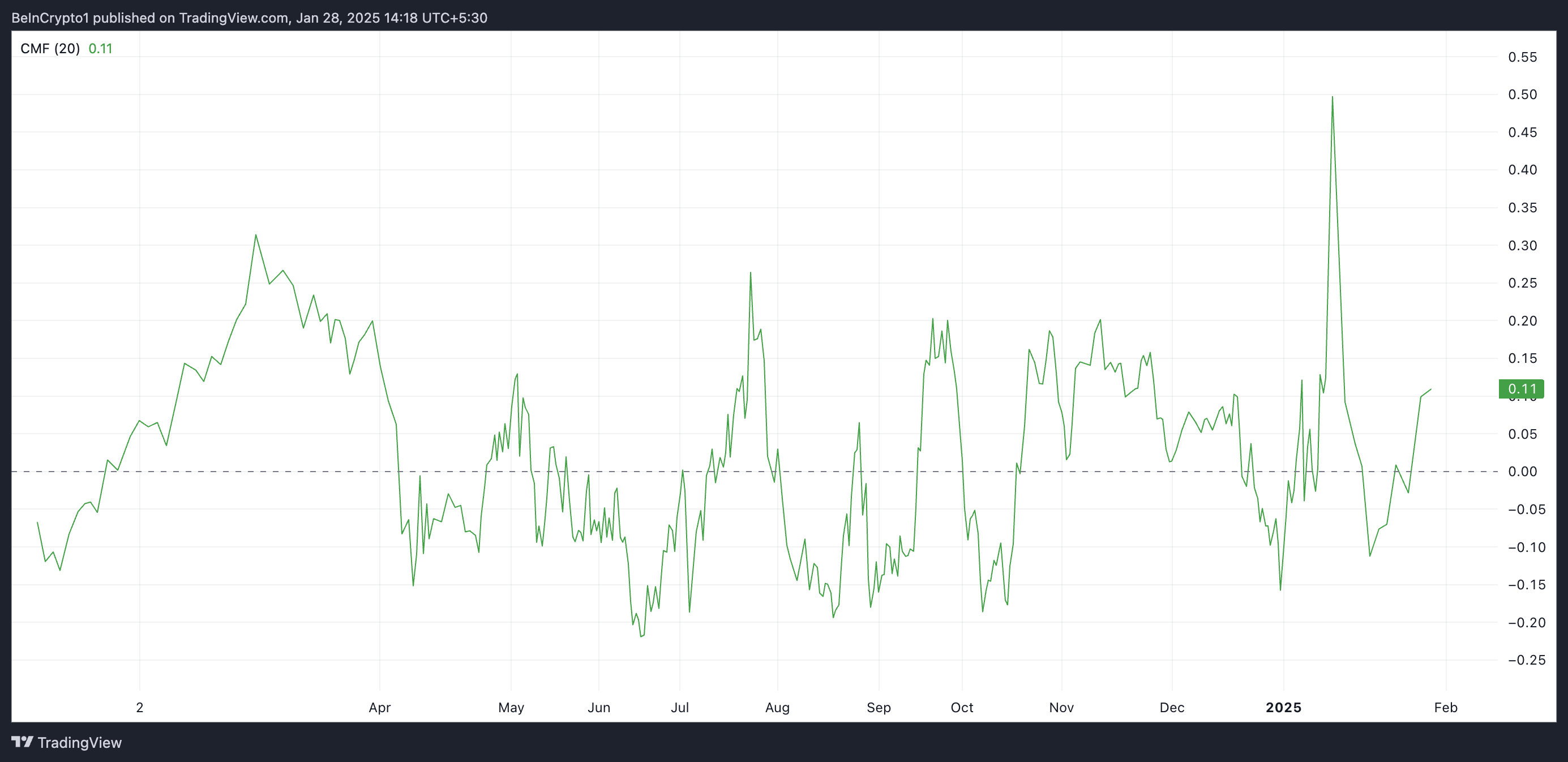 Hơn nữa, Chỉ số Chaikin Money Flow (CMF) của JUP nằm trên đường zero ở mức 0.11 tại thời điểm viết bài. Chỉ số này cũng đo lường cách dòng tiền vào và ra khỏi một tài sản.