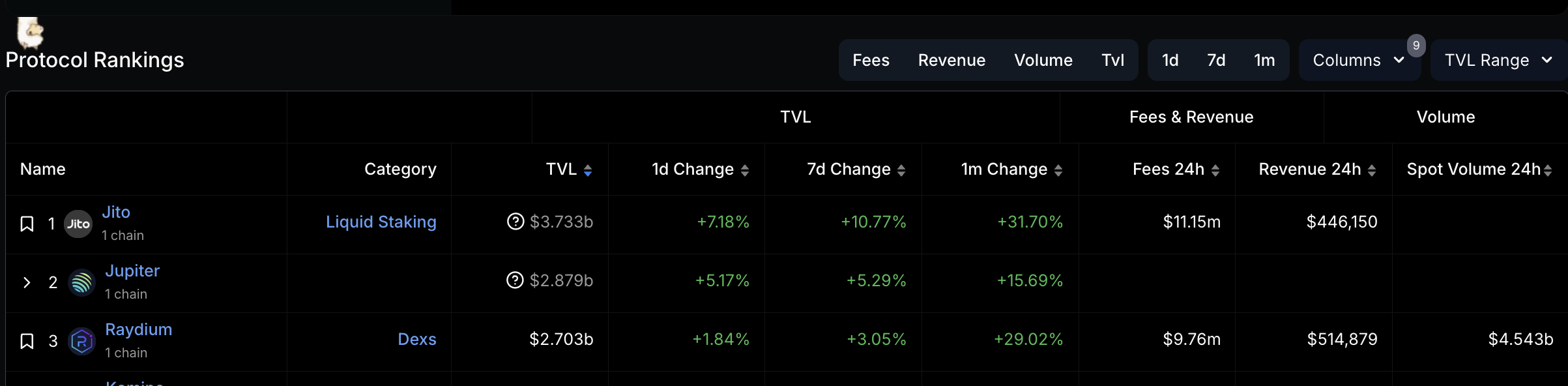 TVL của Jupiter đã tăng 5% trong tuần qua. Theo DefiLlama, hiện tại nó đạt 2.87 tỷ USD, giữ vị trí là giao thức lớn thứ hai trên Solana theo TVL. Sự tăng trưởng gần đây này đã đẩy Raydium xuống vị trí thứ ba với TVL là 2.70 tỷ USD.