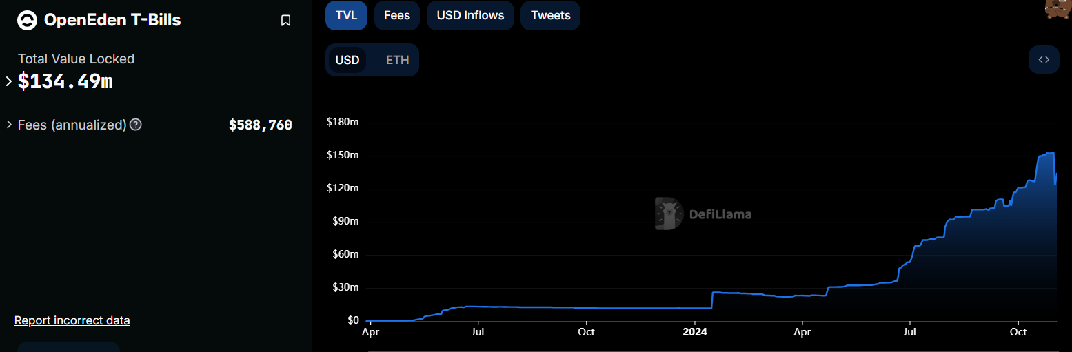 Theo dữ liệu từ DeFillama, TVL của OpenEden đã giảm mạnh từ khoảng 153 triệu USD xuống còn 123 triệu USD vào ngày 01/11. Tuy nhiên, chỉ số này đã phục hồi nhẹ lên 134.5 triệu USD tại thời điểm viết bài. Tổng giá trị bị khóa, hay TVL, đo lường lượng tiền điện tử được giữ trong các hợp đồng thông minh của một nền tảng. Khi TVL giảm, điều này cho thấy người dùng có thể đang rút tiền, thường do mất niềm tin vào nền tảng hoặc tìm kiếm các lựa chọn đầu tư tốt hơn.