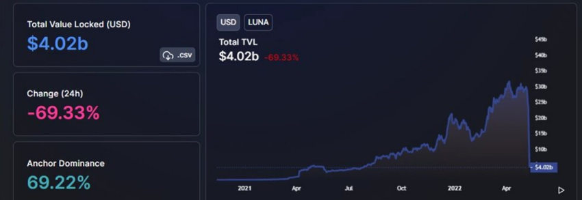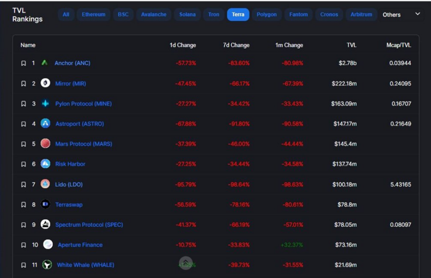 Theo nghiên cứu về tiền điện tử của BeInCrypto, Terra đã mất 78% tổng giá trị bị khóa so với ngày đầu tiên của năm 2022. Vào ngày 1 tháng 1, Terra có TVL khoảng 18.4 tỷ USD và con số này giảm xuống còn khoảng 4.02 tỷ đô la vào ngày 11 tháng 5 năm 2022.
