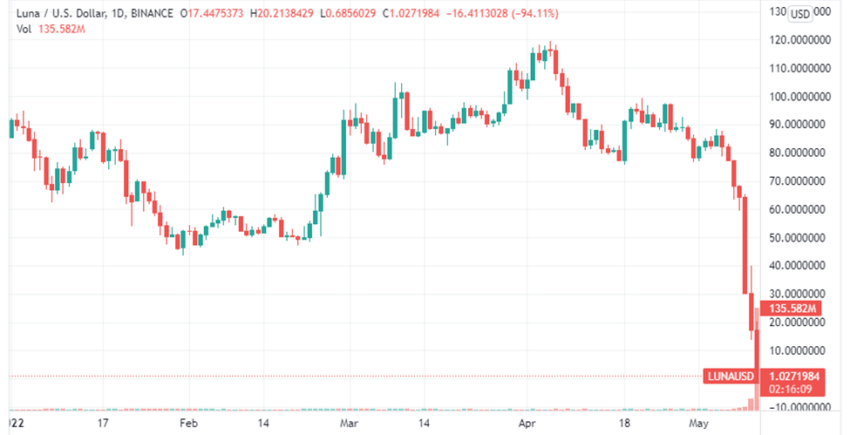 LUNA mở cửa vào năm 2022 với giá giao dịch là 85.51 USD. Đồng coin này đã đạt mức ATH tại 119.18 USD vào ngày 5 tháng 4 và đã giảm xuống dưới 1 USD tính đến thời điểm viết bài. Nguyên nhân do sự cố “de-peg” của một trong hai đồng tiền điện tử chính của hệ sinh thái Terra, stablecoin UST, đã diễn ra trong vài ngày qua.