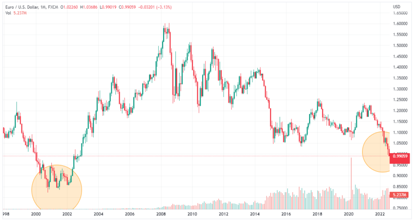Dữ liệu lịch sử cho thấy đây là lần thứ hai kể từ năm 2002 đồng Euro giảm xuống dưới đô la Mỹ. Hiện tại, EUR có giá từ 0.990 đến 1 USD. Đồng tiền này đã giảm hơn 15% so với USD trong năm qua. Nó cũng đã chạm mức thấp nhất trong 20 năm, khi châu Âu dường như đang trải qua một cuộc khủng hoảng do ảnh hưởng của cuộc xâm lược Ukraine của Nga.