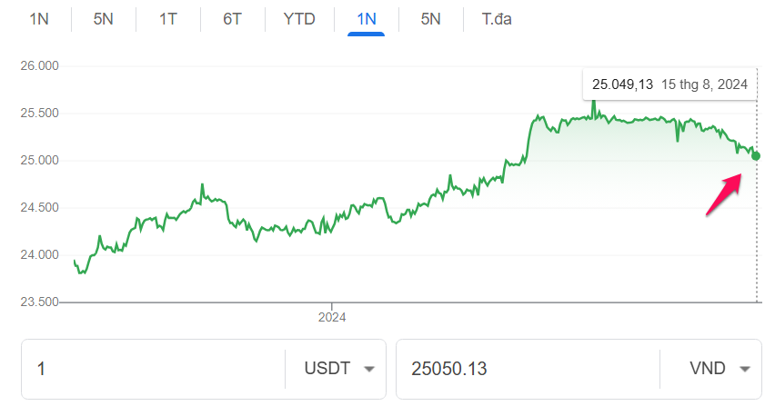 Mức cao nhất của của tỷ giá USDT/VND trong suốt một năm qua là 26,100 VND. Biểu đồ từ dữ liệu tìm kiếm Google cho thấy, trong những ngày giữa tháng 8, giá USDT/VND dường như đang có khuynh hướng bước vào xu hướng giảm.