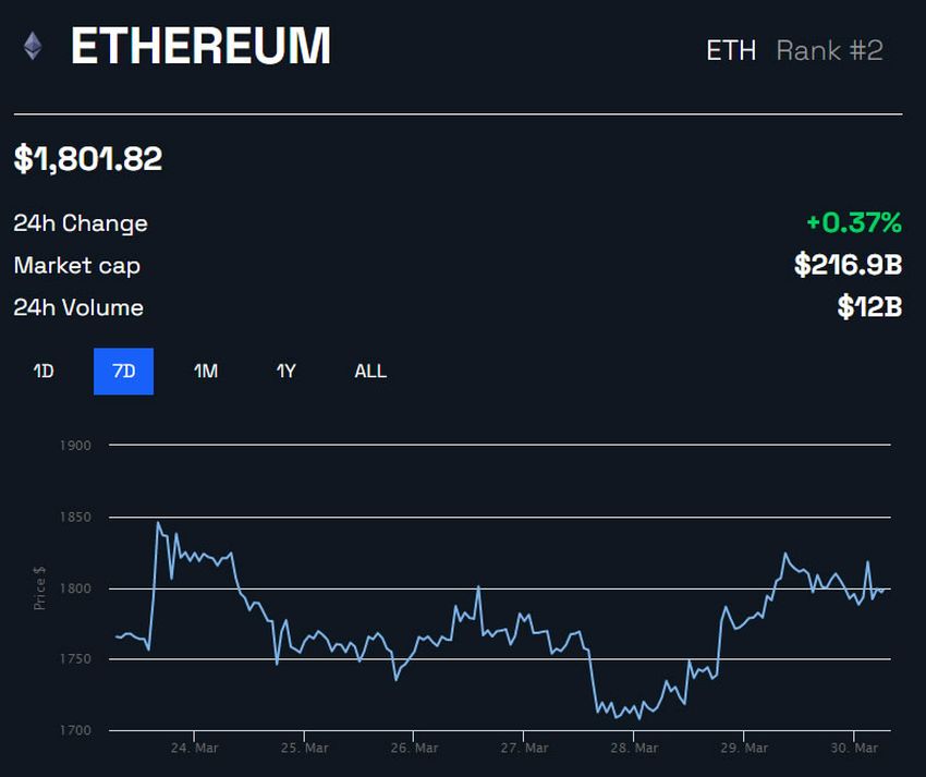 Giá ETH không thay đổi nhiều trong 24 giờ qua. Tuy nhiên, tài sản này đã phục hồi trở lại mức 1,800 USD tại thời điểm BeInCrypto viết bài.
