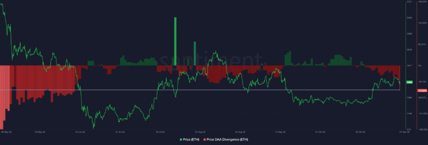 Sự phân kỳ giá DAA báo hiệu xu hướng giảm và đã ở mức thấp trong một khoảng thời gian. Vào tháng 6 năm nay, khi biểu đồ ETH ghi nhận sự phân kỳ DAA mức tương tự, giá Ethereum đã giảm gần 30%. Trước đó, sự phân kỳ DAA của giá ETH đã không giảm xuống mức này kể từ tháng 6.