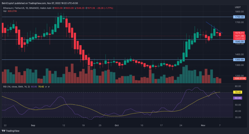 Các kế hoạch này đã khiến giá ETH tăng 6% vào thứ 6. Tuy nhiên, vào thời điểm BeInCrypto viết bài này, giá ETH được giao dịch ở mức 1,575 USD, giảm 2.65% so với ngày trước.