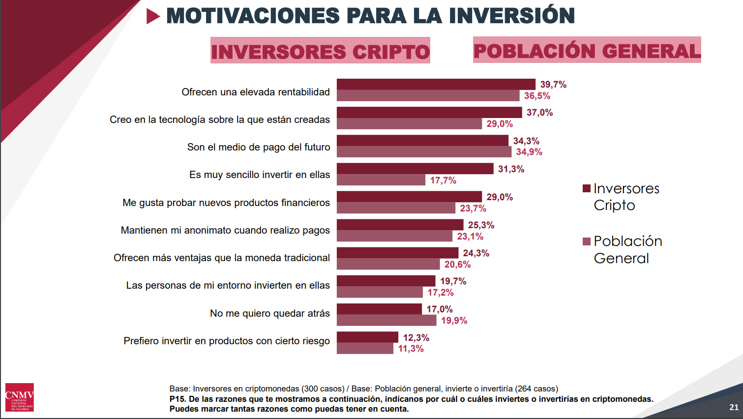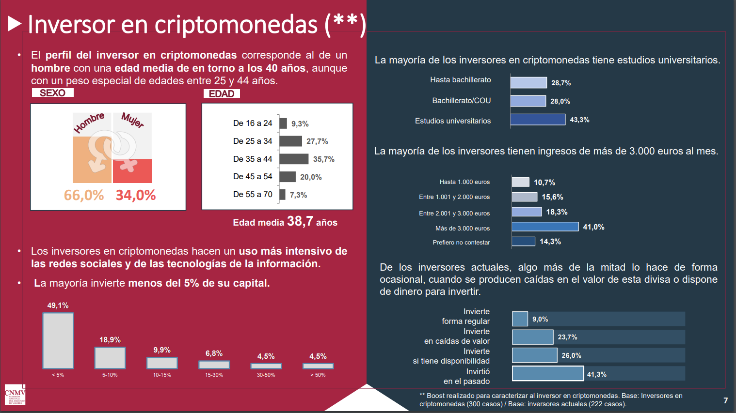 Theo khảo sát của Ủy ban Chứng khoán Tây Ban Nha (CNMV), có 6.8% người dân Tây Ban Nha đầu tư tiền điện tử. Đa số các nhà đầu tư là nam giới và khoản đầu tư được đồng tình nhiều nhất là dưới 5%.