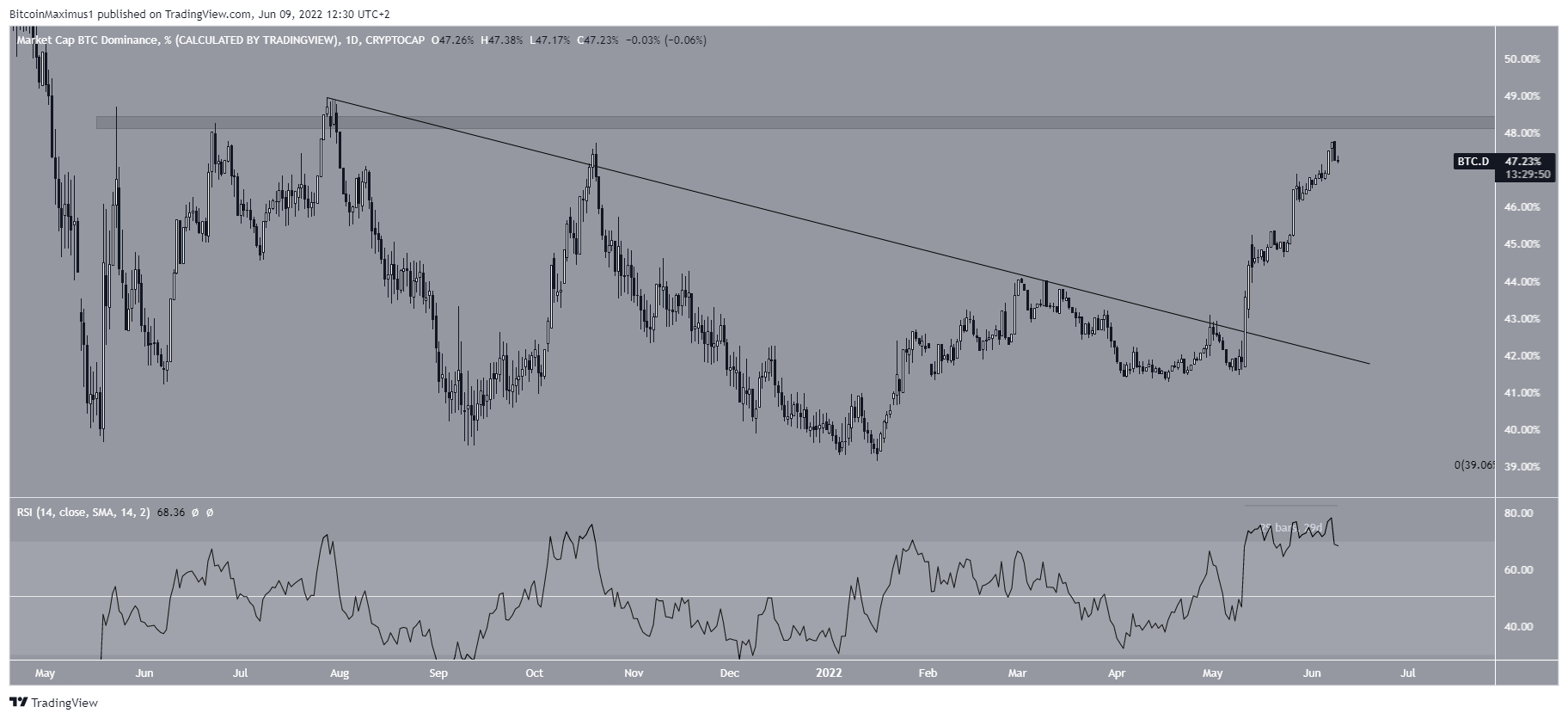 Trong khoảng thời gian từ tháng 5 năm 2021 đến tháng 1 năm 2022, BTC.D đã tăng gấp ba lần ở vùng hỗ trợ dài hạn 40%.